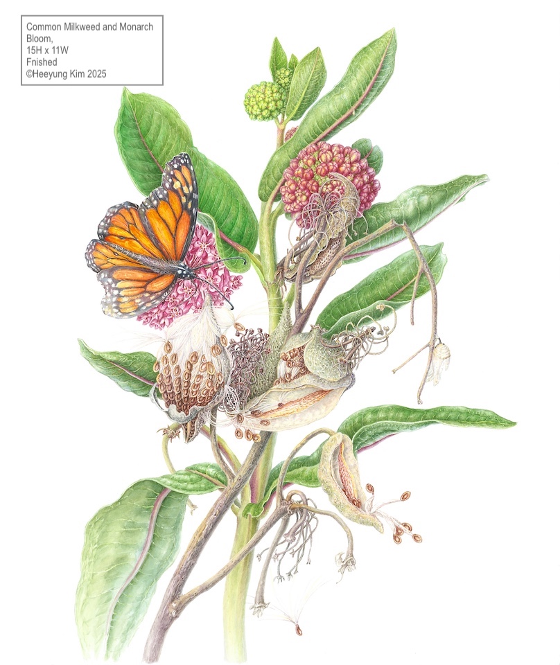 Credit: Heeyoung Kim. Common Milkweed and Monarch (Bloom). Watercolor, 2025. Courtesy of the Artist.